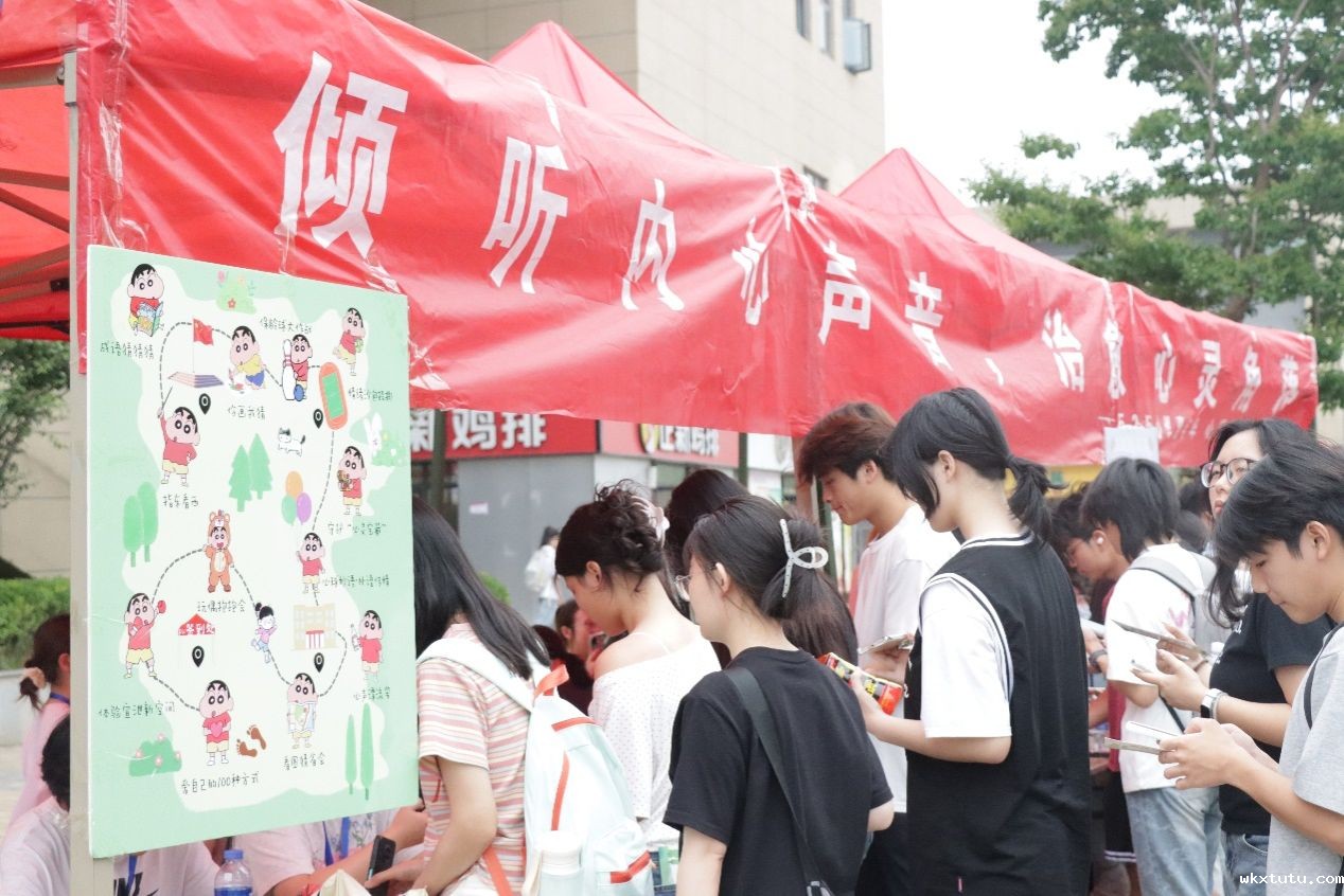 游园会活动规划了休闲区、体验区、探索区、挑战区,各区域点布置创意十足,同学们参与热情高涨。在味园前,同学们执笔书写“爱自己的100种方式”,让温情暖语跃然纸上,与玩偶相拥,在柔软触感中卸下满身疲惫。大学生活动中心内,同学们奋力吹爆象征压力的气球、随机抽取各省地图,开启心灵漫游,青春广场上,抛掷情绪沙包释放烦恼,双人协作守护“心灵宝藏”,更有“表情猜成语”“指东看西”“保龄球大作战”等趣味活动轮番上阵。现场欢声笑语不断,同学们在游戏中释放压力、感悟自我,在协作与挑战中学会接纳与成长。